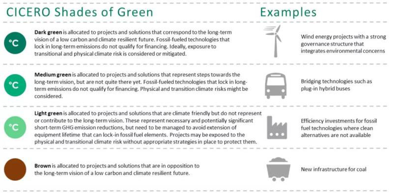 這一框架已被獨(dú)立審查機(jī)構(gòu)(挪威CICERO Shades of Green)授予最高綠色等級(jí)的主權(quán)債券(“深綠”)。CICERO Shades of Green跟據(jù)投資項(xiàng)目對(duì)氣候、環(huán)境的影響綠色債券分為深綠、中綠、淺綠三種,為投資者提供透明度。