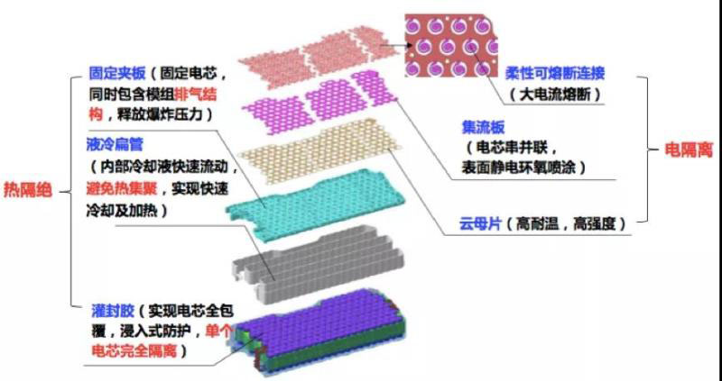 第二層級(jí):模組,通過(guò)模組電隔離與熱隔絕方案實(shí)現(xiàn)單個(gè)電芯爆噴后能量釋放受控;