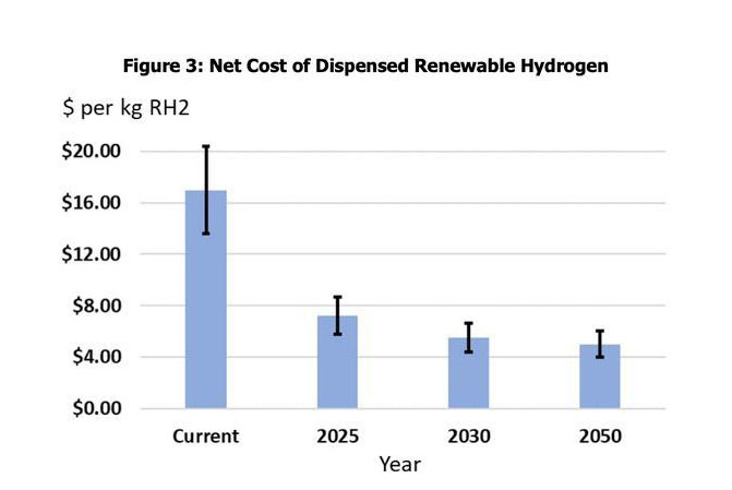 加州政府預(yù)計(jì),到2025年加州氫燃料的出廠價(jià)格會(huì)降低到每公斤2美元。而加氫站的分發(fā)價(jià)格會(huì)降低到每公斤6-8.5美元,大大低于目前每公斤13-16美元的價(jià)格。如果按照行駛里程換算的話,這大致相當(dāng)于氫燃料車主的加氫成本是每加侖(3.7854升)汽油價(jià)格2.4-3.4美元,基本和加州目前的汽油價(jià)格持平。