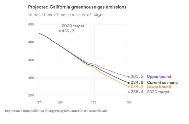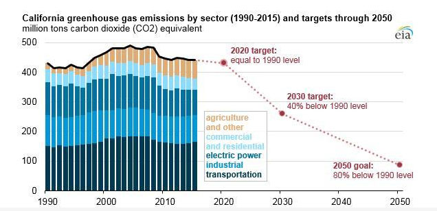 2017年,加州政府頒布州法AB 398,提出了美國最激進(jìn)的減排目標(biāo);計(jì)劃到2030年將溫室氣體排放量在1990年水平上減少40%,到2050年實(shí)現(xiàn)溫室氣體比1990年減少80%。這意味著加州2030年二氧化碳排放量將從2017年的4.24億噸急劇減少到2.58億噸。
