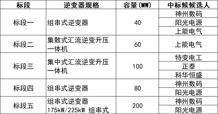 近日,中廣核新能源2020年第一批逆變器集采發(fā)布中標(biāo)候選人公示,根據(jù)招標(biāo)公告,本次集采共分為5個標(biāo)段,規(guī)模共計(jì)480MW。其中,一、四、五標(biāo)段的第一中標(biāo)候選人為神州數(shù)碼(華為),規(guī)模共計(jì)320MW;第二標(biāo)段規(guī)模60MW,僅有一位中標(biāo)候選人,為上能電氣;三標(biāo)段規(guī)模100MW,第一中標(biāo)候選人為特變電工。