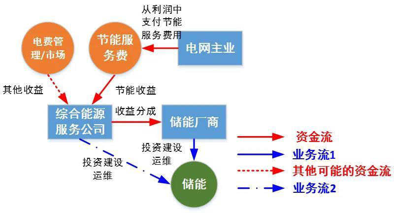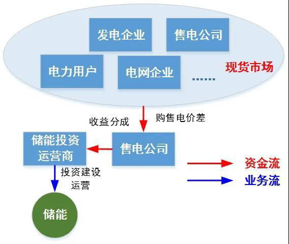 競爭性業(yè)務(wù)模式適用于提供調(diào)頻等輔助服務(wù)、移峰填谷和提高新能源利用水平三類場景的電網(wǎng)側(cè)儲能應(yīng)用,按照投資回收方式不同,該商業(yè)模式又可細(xì)分為合同能源管理模式、兩部制電價模式、輔助服務(wù)市場模式、現(xiàn)貨交易市場模式和綜合模式。競爭性業(yè)務(wù)模式由可參與市場競爭的社會資本投資,業(yè)務(wù)受輸配電價監(jiān)管的電網(wǎng)主業(yè)不允許投資。各商業(yè)模式的關(guān)系示意圖如圖2~圖6所示。