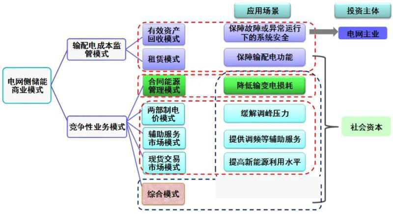 我國電網(wǎng)側(cè)儲能尚缺乏成熟的商業(yè)模式,結(jié)合中國政策要求和電力體制改革情況,考慮投資主體、投資回收機(jī)制、業(yè)務(wù)監(jiān)管機(jī)制等因素,電網(wǎng)側(cè)儲能的潛在商業(yè)模式可分為輸配電成本監(jiān)管模式和競爭性業(yè)務(wù)模式兩大類。輸配電成本監(jiān)管模式適用于保障故障或異常運(yùn)行下的系統(tǒng)安全和保障輸配電功能兩類場景的電網(wǎng)側(cè)儲能應(yīng)用,按照投資回收方式不同,該商業(yè)模式又可細(xì)分為有效資產(chǎn)回收模式和租賃模式。有效資產(chǎn)回收模式由于資產(chǎn)要進(jìn)入輸配電價核算,因此只能由業(yè)務(wù)受到監(jiān)管的電網(wǎng)主業(yè)投資;租賃模式可由社會資本投資,但租賃費(fèi)用由價格主管部門負(fù)責(zé)核定和監(jiān)管。