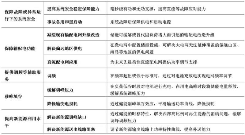 為更好利用電網(wǎng)側(cè)儲能,有必要將其應(yīng)用場景進(jìn)行細(xì)分,分為5大類,分別為保障故障和異常運(yùn)行下的系統(tǒng)安全、保障輸配電功能、提供調(diào)頻等輔助服務(wù)、移峰填谷和提高新能源利用水平,如表1所示。
