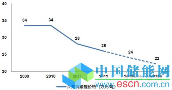 行業(yè)發(fā)展初期,由于我國六氟磷酸鋰供不應(yīng)求,造就行業(yè)的高盈利水平,毛利率高達60%左右。近幾年,隨著日韓企業(yè)產(chǎn)能的快速擴張以及中國多氟多、九九久等批量生產(chǎn)以來,六氟磷酸鋰的價格逐步下降,2012年均價下降到28萬噸/元,年底的價格甚至回落到18. 57萬元/噸(中國電池網(wǎng)注:2013年年底部分品牌已降到15-17萬元/噸左右,2014年仍有下降趨勢)。