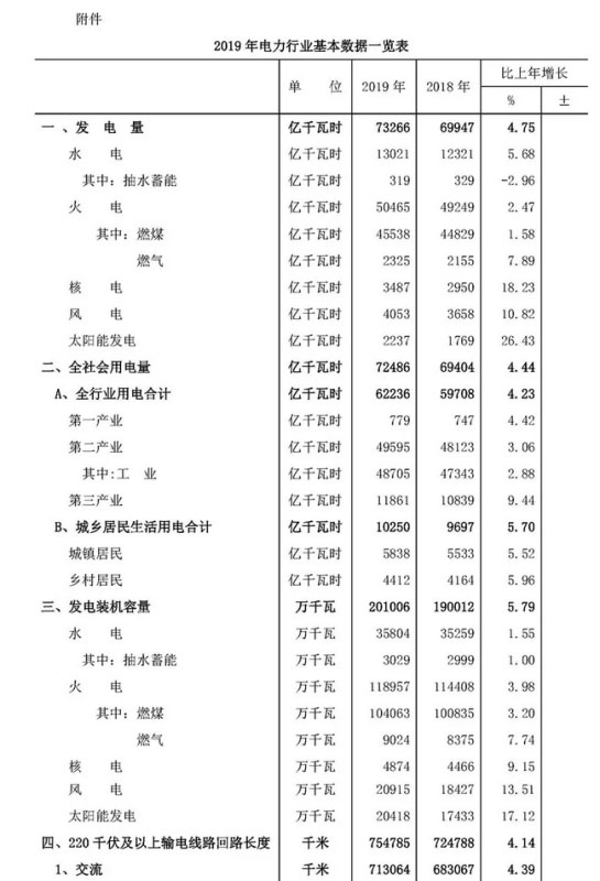 2019年,全國全口徑發(fā)電量為73266億千瓦時,比上年增長4.7%,增速比上年降低3.6個百分點。其中,水電13021億千瓦時,比上年增長5.7%(抽水蓄能319億千瓦時,比上年下降3.0%);火電50465億千瓦時,比上年增長2.5%(煤電45538億千瓦時,比上年增長1.6%;氣電2325億千瓦時,比上年增長7.9%);核電3487億千瓦時,比上年增長18.2%;并網(wǎng)風電4053億千瓦時,比上年增長10.8%;并網(wǎng)太陽能發(fā)電2237億千瓦時,比上年增長26.4%。
