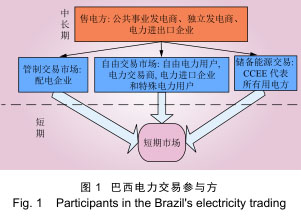 為兼顧電力普遍供應(yīng)及合理化電價水平,促進電力行業(yè)投資和發(fā)展,巴西政府將電力買賣市場分為管制交易市場(Ambiente de Contrata??oRegulada, ACR)、自由交易市場(Ambiente deContrata??o Livre, ACL)和短期交易市場。其中,管制交易市場是主要組成部分,主要是確保絕大部分電力用戶特別是議價能力較低的中小企業(yè)和普通居民的用電需求得到滿足,市場交易多為長期合約,確保發(fā)電及用電雙方中長期供需的穩(wěn)定,這部分用戶數(shù)量較多,用電量也較大,市場份額約 70%。自由交易市場是重要組成部分,主要是通過市場競爭促使電力服務(wù)商在確保電能質(zhì)量的前提下降低成本,提升運營和服務(wù)效率,并促進發(fā)電領(lǐng)域投資,主要以大企業(yè)用戶為主,市場份額 25%~30%。短期交易市場作為前兩個市場補充,以現(xiàn)貨合約為主,旨在保障電力供需平衡,市場份額約 5%。各參與方如圖 1 所示。