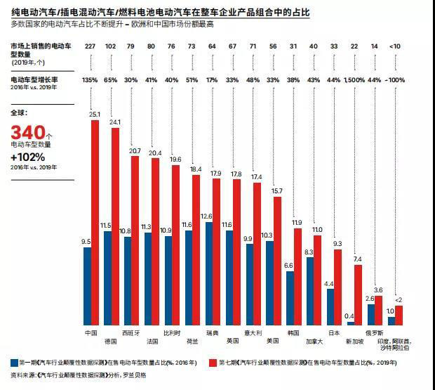 相較第六期報(bào)告,純電動汽車與插電混動汽車銷售增速有所放緩。接受調(diào)研的18個(gè)國家在2019年和2018年的銷量分別為210萬輛和190萬臺,年增長率為10.5%。相比之下,盡管全球汽車銷量停滯不前,但為實(shí)現(xiàn)降低碳排放的目標(biāo),電動汽車銷量仍需實(shí)現(xiàn)兩位數(shù)的年增長率。目前超過340款純電動和插電混動車型已在《汽車行業(yè)顛覆性數(shù)據(jù)探測》報(bào)告中的18個(gè)國家銷售,相比2016年第一期報(bào)告中的125款車型有著大幅增加。