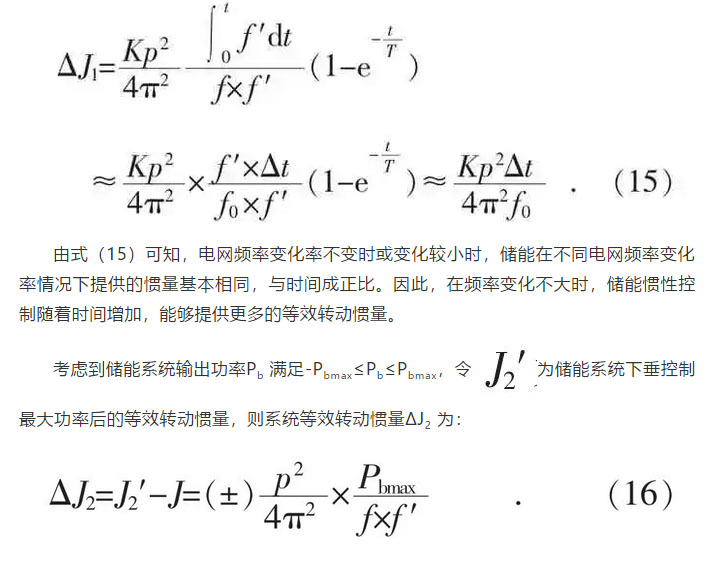 儲(chǔ)能系統(tǒng)對(duì)電網(wǎng)輸出或吸收功率,通過(guò)功率交換實(shí)際上提供了系統(tǒng)額外等效慣量。根據(jù)轉(zhuǎn)子運(yùn)動(dòng)方程,計(jì)算了頻率變化時(shí)輸出功率和等效轉(zhuǎn)動(dòng)慣量的關(guān)系。根據(jù)儲(chǔ)能系統(tǒng)典型控制方式,計(jì)算了不同控制方法下儲(chǔ)能系統(tǒng)等效轉(zhuǎn)動(dòng)慣量的特性。