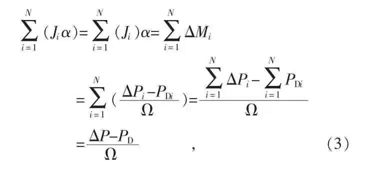 式中:N 為電網(wǎng)同步電機(jī)數(shù)量;Ji,ΔMi,ΔPi(i=1,2,…,N),PDi(i=1,2,…,N)分別為不同同步發(fā)電機(jī)的轉(zhuǎn)子轉(zhuǎn)動(dòng)慣量、不平衡轉(zhuǎn)矩、不平衡功率和阻尼功率;ΔP 為系統(tǒng)不平衡總功率;PD 為系統(tǒng)總阻尼功率。