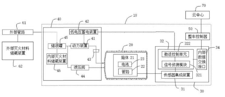 根據(jù)原理,當傳感器感應到動力電池的熱失控偵測信號,依據(jù)熱失控偵測信號判斷動力電池是否失火,如果判斷為未失火,整車控制器會將信號上傳至云中心;如果判斷為失火,則會啟動滅火裝置對動力電池進行滅火工作。