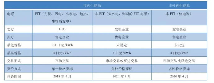 如表5所列,非化石價(jià)值證書分為可再生能源,非可再生能源兩大類,核電被劃定為非可再生能源類,其用途僅限于向政府主管部門申報(bào)碳排放核減之用??稍偕茉搭愑挚煞譃镕IT電力(可再生能源)和非FIT電力(包括大水電以及到期的FIT可再生能源)兩類。因此,非化石價(jià)值證書總共三種:FIT非化石價(jià)值證書(可再生能源),非FIT非化石價(jià)值證書(可再生能源),非FIT非化石價(jià)值證書(非可再生能源)。其中FIT非化石價(jià)值證書從2018年5月起開始交易,出售方為FIT資金管理機(jī)構(gòu)(低碳投資促進(jìn)機(jī)構(gòu),GIO),購(gòu)買方為售電企業(yè),F(xiàn)IT非化石證書競(jìng)拍最高限價(jià)為4日元/kWh,最低限價(jià)為1.3日元/kWh。原則上競(jìng)拍每季度舉行一次。非FIT非化石價(jià)值證書將從2020年4月開始競(jìng)拍。政府希望通過市場(chǎng)交易回收部分可再生能源補(bǔ)貼費(fèi)用。