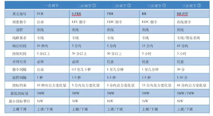 響應(yīng)時(shí)間最快的是一次調(diào)節(jié)服務(wù),電網(wǎng)的頻率一旦偏離額定值時(shí),機(jī)組的控制系統(tǒng)就會(huì)自動(dòng)地根據(jù)負(fù)荷的變化控制機(jī)組有功功率的增減,限制電網(wǎng)頻率變化,響應(yīng)時(shí)間在10秒以內(nèi),持續(xù)時(shí)間5分鐘以上,適用于可變速機(jī)組(GF)和可瞬間響應(yīng)的儲(chǔ)能設(shè)備。