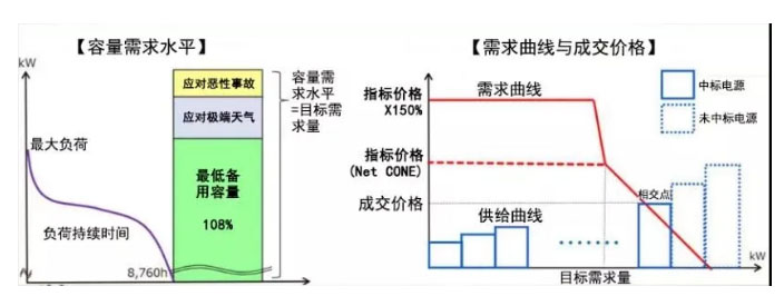 日本容量市場(chǎng)是集中式的容量市場(chǎng),容量需求和指標(biāo)價(jià)格由OCCTO確定。OCCTO根據(jù)2019年度的供電計(jì)劃,目前設(shè)定2024年容量需求為1.8億kW,如圖12(左)所示,容量需求的計(jì)算依據(jù)是:系統(tǒng)最低備用容量為H3的8%,應(yīng)對(duì)極端天氣的備用容量為H3的2%以及應(yīng)對(duì)惡性事故的備用容量為H3的1%。圖6(右)為反映容量?jī)r(jià)格與容量需求量關(guān)系的曲線,OCCTO以新建機(jī)組的投資回收年限設(shè)定指標(biāo)價(jià)格(Net CONE),現(xiàn)為9444日元/kW,競(jìng)標(biāo)上限價(jià)格不得超過指標(biāo)價(jià)格的150%。OCCTO以容量目標(biāo)水平為基礎(chǔ)設(shè)定需求曲線,以發(fā)電企業(yè)投標(biāo)容量形成供給曲線,以投標(biāo)價(jià)格與需求價(jià)格的相交點(diǎn)確定成交價(jià)格,當(dāng)?shù)陀谀繕?biāo)需求量時(shí)價(jià)格急速跳高,當(dāng)高于需求量時(shí)價(jià)格緩慢下落,所有交易成功的容量都將按這個(gè)價(jià)格支付費(fèi)用。