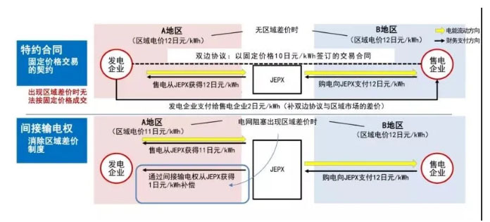 通常輸電權(quán)可以分為物理輸電權(quán)和金融輸電權(quán),分別表現(xiàn)為對(duì)于輸電容量的使用權(quán)和收益權(quán)。2019年4月,日本啟動(dòng)了間接輸電權(quán)交易市場(chǎng),其中輸電權(quán)是指物理跨區(qū)輸電容量的使用權(quán),輸電權(quán)所有者僅有自己獲得相關(guān)輸電服務(wù)的權(quán)力,不可以轉(zhuǎn)賣,沒有收益權(quán)。間接輸電權(quán)一般是指當(dāng)電網(wǎng)發(fā)生阻塞時(shí),在現(xiàn)貨批發(fā)市場(chǎng)所約定的電能量范圍內(nèi),交易方有權(quán)要求JEPX支付區(qū)域市場(chǎng)差價(jià)的權(quán)利。因此,日本的間接輸電權(quán)可稱為“責(zé)任型”輸電權(quán),是分區(qū)電價(jià)結(jié)算差價(jià)的一種契約,而非歐美國(guó)家的權(quán)益型輸電權(quán)。