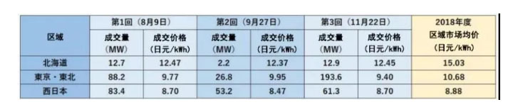 如表2所示,2020年日本交割的基荷電力分別于2019年8月、9月和11月進(jìn)行了競(jìng)價(jià)交易,分為北海道、東京?東北和西日本三個(gè)區(qū)域市場(chǎng)進(jìn)行。北海道地區(qū)價(jià)格達(dá)到12.37~12.47日元/kWh、東京?東北地區(qū)為9.40~9.95日元/kWh、西日本地區(qū)為8.47~8.70日元/kWh。而2018年度三區(qū)域現(xiàn)貨平均價(jià)格分別為北海道15.03日元/kWh、東京?東北10.68日元/kWh、西日本8.88日元/kWh。從交易價(jià)格來看,基荷電力市場(chǎng)價(jià)格盡管低于現(xiàn)貨市場(chǎng)價(jià)格1-2日元/kWh,但實(shí)際上與新增電力公司同大電力公司簽訂的中長(zhǎng)期雙邊協(xié)議價(jià)格相差無幾,基荷市場(chǎng)并未突顯現(xiàn)出價(jià)格優(yōu)勢(shì)。從交易量來看,北海道市場(chǎng)為27.8MW、東京?東北市場(chǎng)308.6MW、西日本市場(chǎng)為197.9MW,三個(gè)市場(chǎng)成交電量為534.3MW,相當(dāng)于46.8億kWh/年,僅占新增電力公司2018年度全部售電量(1229億kWh)的3.8%。因此,新增電力公司更傾向通過中長(zhǎng)期協(xié)議獲得大電力公司的備用電源,或者通過資本紐帶依附于大電力公司抵御風(fēng)險(xiǎn)。