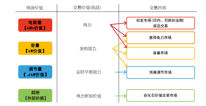 2017年2月,日本提出新電力市場(chǎng)建設(shè)方案,如圖4所示,新電力市場(chǎng)設(shè)計(jì)理念改變了傳統(tǒng)電力市場(chǎng)統(tǒng)一以kWh體現(xiàn)價(jià)值的體系,明確將電力價(jià)值區(qū)分為kW價(jià)值(容量?jī)r(jià)值)、kWh價(jià)值(度電價(jià)值)和⊿kW價(jià)值(平衡服務(wù)價(jià)值),并分別設(shè)計(jì)了與體現(xiàn)這些價(jià)值相對(duì)應(yīng)的新電力市場(chǎng)規(guī)劃,2017年2月,經(jīng)過反復(fù)論證,政府完成了相關(guān)市場(chǎng)的整體架構(gòu)設(shè)計(jì)。與此同時(shí)陸續(xù)開啟了非化石價(jià)值交易市場(chǎng)(2018年5月)、間接輸電權(quán)市場(chǎng)(2019年4月)、基荷電力市場(chǎng)(2019年8月)、容量市場(chǎng)(2020年7月)、供需調(diào)節(jié)市場(chǎng)(2021年4月),向統(tǒng)一大電力市場(chǎng)的建設(shè)目標(biāo)進(jìn)一步邁進(jìn)。