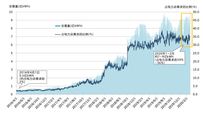 2003年11月,日本在第三輪電改中就設(shè)立了發(fā)、售電企業(yè)交易的電力批發(fā)市場(chǎng)(JEPX),但仍以中長(zhǎng)期合約雙邊交易為主。經(jīng)過多年培育,現(xiàn)已形成以日前市場(chǎng)為主,包括日內(nèi)市場(chǎng)、遠(yuǎn)期市場(chǎng)以及場(chǎng)外公告牌市場(chǎng)的電力交易體系。從2012年到2018年,日本交易所電能量交易年均增長(zhǎng)73.9%,占全社會(huì)用電量比重,由2016年4月的0.5%快速增長(zhǎng)至2019年12月的39.5%,一改中長(zhǎng)期合約一統(tǒng)天下的局面。