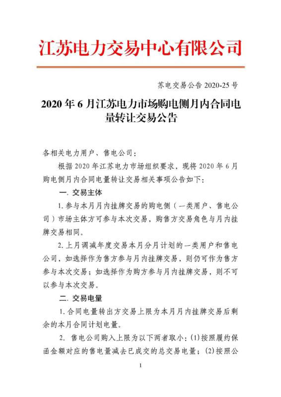 2020年6月江蘇電力市場購電側(cè)月內(nèi)合同電量轉(zhuǎn)讓交易公告