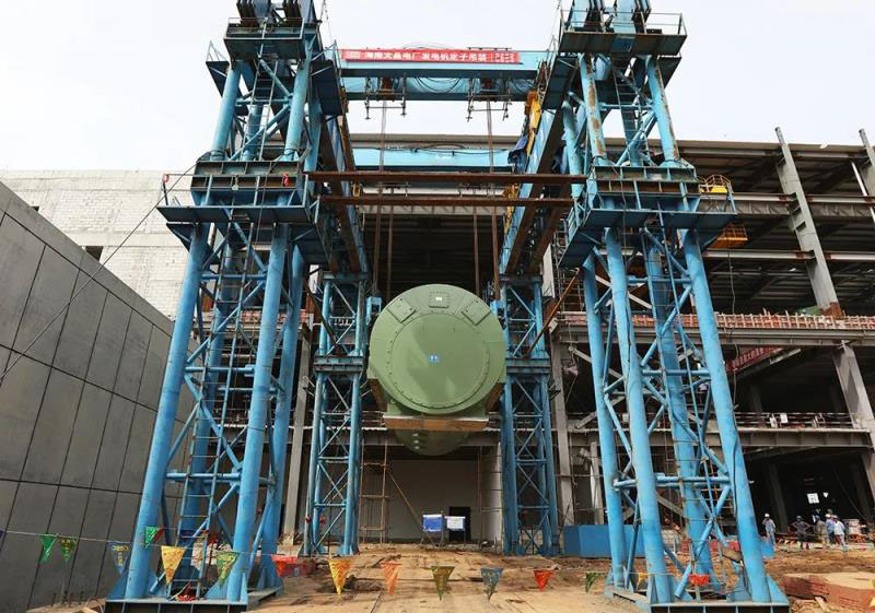 圖為文昌燃氣電廠進行發(fā)電機定子吊裝。