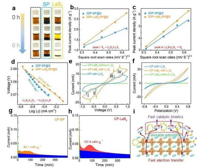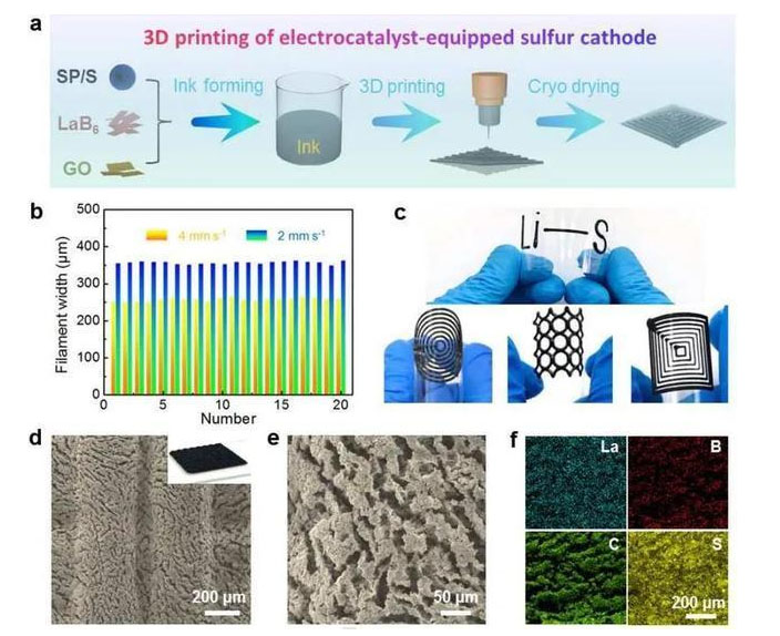 研究人員利用3D打印技術(shù),方便、高效、便捷地構(gòu)筑了高負(fù)載硫正極,該架構(gòu)具有經(jīng)過優(yōu)化的離子/電子傳輸通道和充足的孔隙率,有利于對多硫化物進(jìn)行高效管理。同時(shí),為了更好地抑制“穿梭效應(yīng)”,研究人員設(shè)計(jì)了包含硫/碳和LaB6電催化劑的混合墨汁,用于打印高性能的硫正極。金屬性LaB6電催化劑可以均勻地分布在3D打印的架構(gòu)內(nèi),自發(fā)地確保有豐富的活性位點(diǎn)用于多硫化物的固定和轉(zhuǎn)化,從而實(shí)現(xiàn)高效率的放電或充電過程。