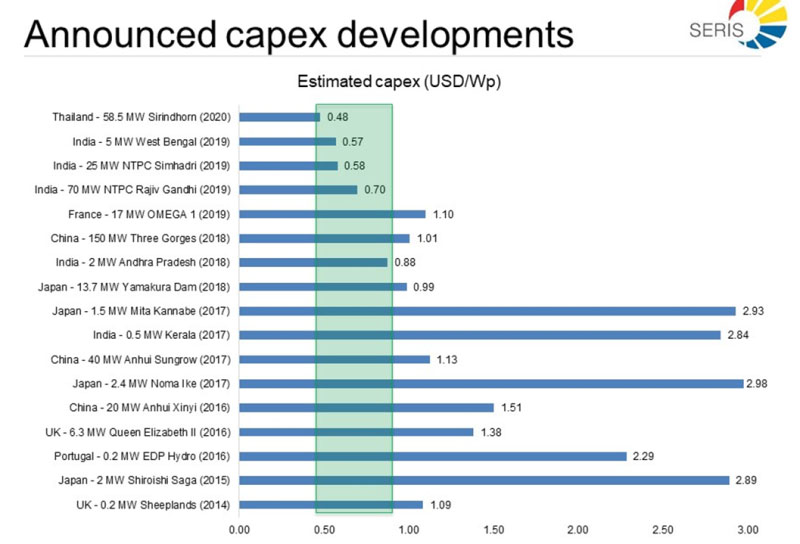 根據(jù)項目場地條件、環(huán)境、規(guī)模,浮動光伏投資成本相差很大:最低是泰國58.5兆瓦項目(0.48美元/瓦),最高是日本1.5兆瓦的項目(2.93美元/瓦)。