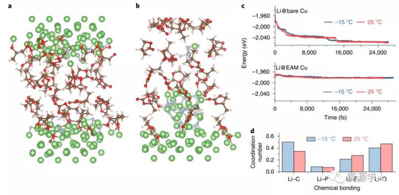 圖8. 通過(guò)建模和定量核磁共振研究低溫SEI化學(xué)。Li和電解質(zhì)界面的模型模擬(a)裸露銅箔(無(wú)氟化鋰)(b)EAMCu(含部分覆蓋鋰表面的LiF),綠色、紅色、藍(lán)色、棕色、粉色和紫色球體分別代表Li、S、O、C、P和F原子;(c)在-15℃和25℃下的的能量時(shí)間曲線(xiàn),揭示了達(dá)到等效平衡點(diǎn)的SEI形成速率;(d)在-15℃和25℃下,基于成對(duì)分布函數(shù)的SEI成分。