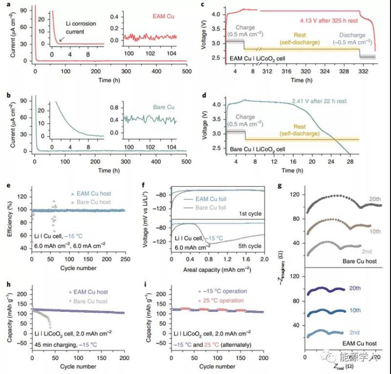 圖7. 低溫條件下的電池性能。(a)EAM Cu(b)裸銅箔鋰腐蝕對(duì)應(yīng)的電流,插圖為放大細(xì)節(jié),在Li|EAM-Cu電池中觀察到電流顯著減??;(c)EAM Cu(d)裸銅箔在Cu/LiCoO2電池的電壓時(shí)間曲線(xiàn),充電電流為0.5 mA/cm2,完全充電的EAM-Cu|LiCoO2電池與快速失效的控制電池相比,表現(xiàn)出有限且低的自放電;在-15℃和6 mA/cm2電流密度下的(e)鋰沉積效率曲線(xiàn)和(f)電壓分布,EAM-Cu能夠?qū)崿F(xiàn)高效率的Li沉積,而裸Cu的效率低且極化嚴(yán)重;(g)鋰銅電池在-15℃的阻抗變化;(h)Li/LiCoO2電池在-15℃的循環(huán)穩(wěn)定性,充電電流為2.67 mA/cm2,電量為2.0 mAh/cm2;(i)含EAM-Cu的Li/LiCoO2電池的循環(huán)穩(wěn)定性,溫度在-15℃和25℃之間每循環(huán)20圈切換一次。