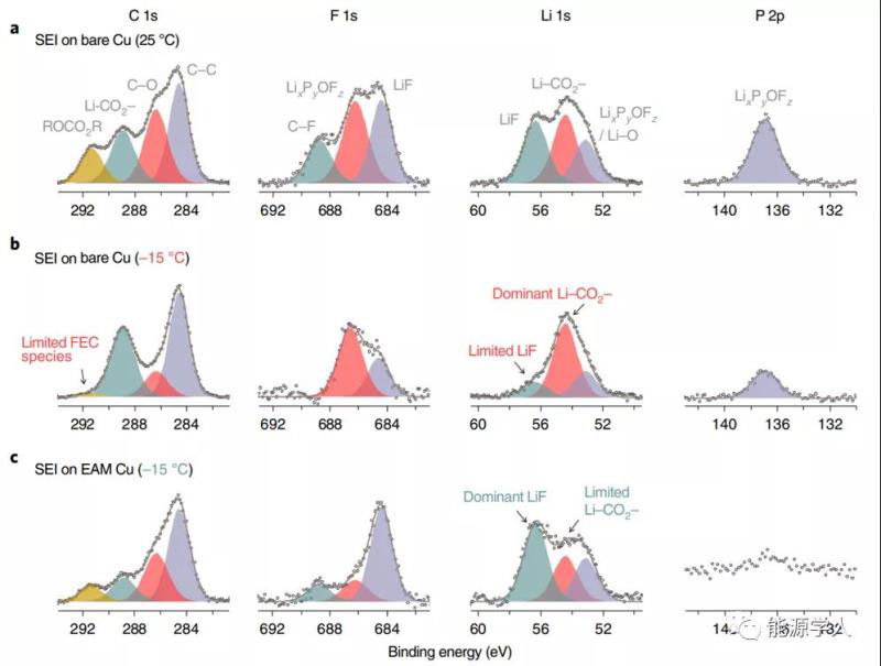 為了確定SEI的組成,對(duì)經(jīng)過(guò)30次循環(huán)的鋰負(fù)極進(jìn)行了XPS分析。分析表明低溫下裸銅表面的SEI膜成分發(fā)生變化,LiF的百分比從25℃時(shí)的36%下降到-15℃時(shí)的14.5%,且Li-CO2-和LixPyOFz成為主導(dǎo)鹽。而EAM的加入可以有效調(diào)節(jié)低溫下SEI成分,LixPyOFz和Li-CO2-的百分比顯著降低,LiF的百分比從14.5%增加到46.8%。