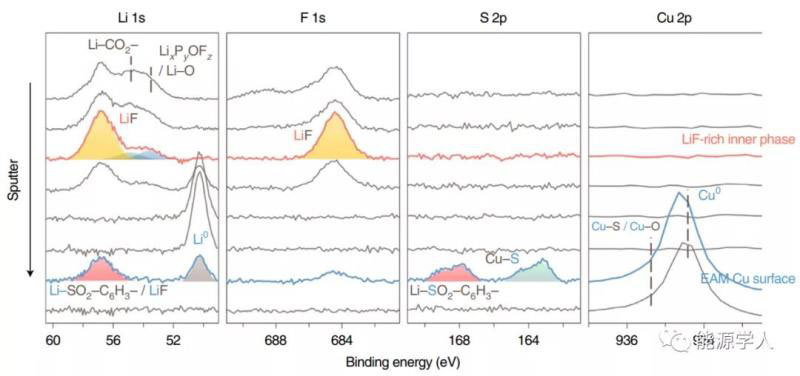圖5. 在界面處的EAM分解納米深度剖面XPS。XPS深度譜Li@EAM循環(huán)10次后,發(fā)現(xiàn)了一個(gè)富含LiF的SEI內(nèi)相。從上到下的曲線(xiàn)表示濺射0、1、2、3、6、100、101和105min后獲得的光譜。基于二氧化硅的濺射速率為~ 10nm/min。