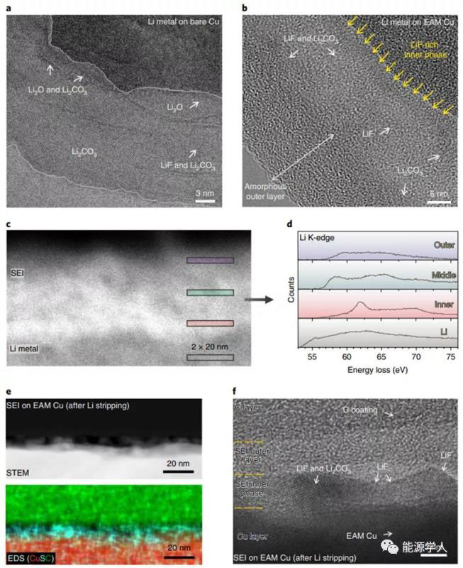為了揭示鋰的均勻沉積行為,用低溫TEM研究了低溫SEI的納米結(jié)構(gòu)。在-15℃時(shí),裸銅和EAM Cu上形成的SEI在納米結(jié)構(gòu)和主要成分方面完全不同。在裸銅上形成的SEI層是高度結(jié)晶的(圖4a),主要有Li2CO3晶體(晶格間距為0.28nm),但也有Li2O(晶格間距為0.27nm)和LiF(晶格間距為0.20nm)晶體。主要的鹽組分Li2CO3通常被認(rèn)為是不利的SEI組分,因?yàn)殁g化不足。這種在-15℃下高度結(jié)晶的SEI結(jié)構(gòu)與在25℃下在裸銅箔上形成的具有更多非晶態(tài)物種的SEI結(jié)構(gòu)完全不同。令人驚訝的是,當(dāng)使用EAM-Cu時(shí),觀察到多層SEI具有富LiF的內(nèi)相、高度非晶態(tài)的外層,以及在它們之間嵌入Li2CO3和LiF納米晶的非晶態(tài)基質(zhì)(圖4b)。作者進(jìn)一步通過(guò)EELS驗(yàn)證了EAM調(diào)控SEI中富含LiF的內(nèi)相的存在,生成了EAM調(diào)節(jié)的鋰離子表面SEI的截面圖像(圖4c)。