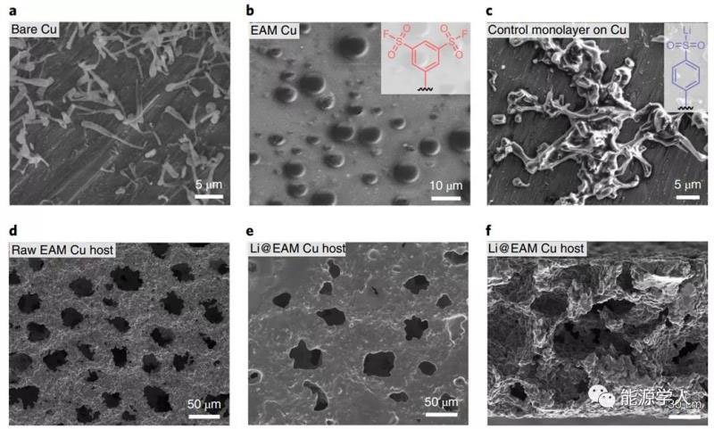 作者首先用SEM研究在EAM-Cu上沉積Li的形貌。在-15℃和6 mA/cm2時(shí),在裸銅箔上形成的鋰晶種具有針狀形態(tài)(圖3a),且小于25℃下形成的鋰晶種。這一發(fā)現(xiàn)意味著鋰枝晶的生長(zhǎng)在低溫下被擴(kuò)大了。相比之下,由EAM引導(dǎo)的鋰晶種是均勻的,并且呈現(xiàn)島狀形態(tài)(圖3b)。作者還研究了苯磺酸鋰(C6H5-SO3Li)自組裝單層膜對(duì)鋰沉積的調(diào)節(jié)作用,該單分子膜親鋰但電化學(xué)不活躍。該層不能誘導(dǎo)均勻的鋰沉積(圖3c),這表明由EAM形成的LiF對(duì)誘導(dǎo)鋰在銅上的成核和均勻的鋰生長(zhǎng)非常重要。然后將EAM連接到具有直徑為45 μm的孔的三維銅主體上(圖3d)。鋰沉積在-15℃下進(jìn)行,電流密度為6.0mA/cm2,容量為6.0 mAh/cm2。30次循環(huán)后,觀察到在EAM-Cu主體上均勻沉積了鋰(圖3i、g),而在裸銅箔上發(fā)現(xiàn)了鋰枝晶。