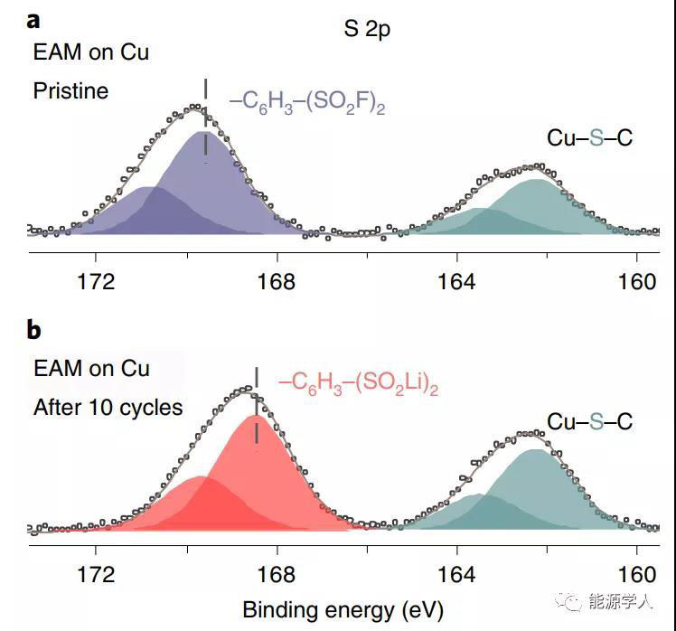 圖2. SEI形成過(guò)程中EAM的原位分解。(a)原始EAM-Cu的高分辨XPS圖譜;(b)EAM-Cu經(jīng)10個(gè)循環(huán)后的高分辨XPS譜圖。鋰沉積后觀察到與EAM分解有關(guān)的峰位移。