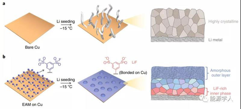 圖1. EAM在銅表面誘導(dǎo)形成低溫穩(wěn)定SEI的示意圖。(a)低溫下鋰在銅基底上的沉積伴隨著針狀鋰的生長(zhǎng)和不穩(wěn)定的SEI。在-15℃下,鋰枝晶生長(zhǎng)迅速,SEI層高度結(jié)晶且不均勻;(b)在電化學(xué)活性1,3-苯二磺酰氟化物(紫色化合物)自組裝單層膜(EAM-Cu)上均勻生長(zhǎng)鋰和穩(wěn)定的SEI層。鋰沉積后,EAM衍生的LiF鹽作為晶核誘導(dǎo)SEI形成富LiF的內(nèi)相,EAM衍生的苯亞磺酸基團(tuán)(紅色化合物)在銅表面結(jié)合成鍵。SEI呈多層結(jié)構(gòu),其內(nèi)相含有大量LiF納米晶(附著在Li表面的紅色層),外層主要由非晶態(tài)物種(頂部的藍(lán)色層)組成,中間層為非晶態(tài)物種,嵌入LiF和Li2CO3納米晶(非晶態(tài)外層和富LiF內(nèi)相之間的層)。