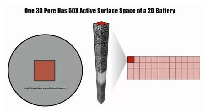 一個(gè)3D孔的活性表面空間是一個(gè)2D電池的50倍