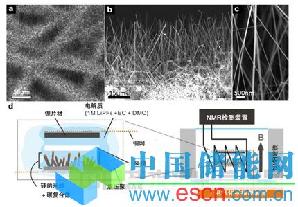 在碳纖維上生長的硅納米線的SEM照片。(a)為平面照片,(b)為截面照片,(c)為(b)的放大圖。(d)為基于硅納米線電極的鋰離子電池及核磁共振檢測器的實(shí)驗概念圖。