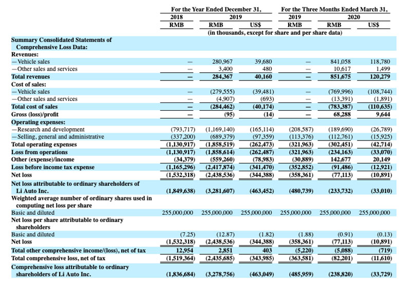 IPO文件顯示,從2018年至2020年的第一季度,理想汽車一直處于凈虧損狀態(tài)。