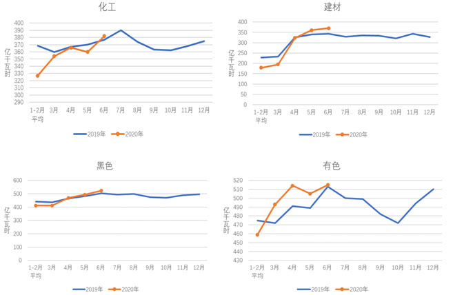 圖4 2019、2020年重點(diǎn)行業(yè)分月用電量情況