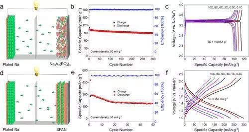 圖5. 快速充電鈉離子和鈉硫電池。(a)Na離子全電池和(d)Na-S全電池的配置示意圖,包括鍍Na作為陽極。鈉離子電池(b、c)和鈉硫(e、f)電池的比較循環(huán)試驗性能和額定容量。