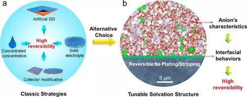 圖1:用于穩(wěn)定鈉金屬陽極的策略示意圖。(a) 經(jīng)典策略(包括集電極改性、人工SEI、固體電解質(zhì)和高濃度電解質(zhì))。(b) 本文新策略:可調(diào)溶劑化結(jié)構(gòu)。