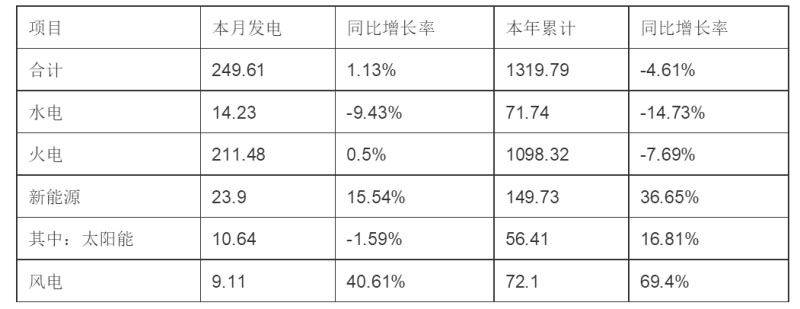 (一)發(fā)電量情況。6月份當月,全省發(fā)電量249.61億千瓦時,同比增加1.13%。其中水電14.23億千瓦時,同比減少9.43%;火電211.48億千瓦時,同比增加0.5%;新能源23.9億千瓦時,同比增長15.54%。