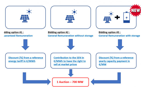 葡萄牙舉行的裝機容量為700MW太陽能發(fā)電容量拍賣活動的三種不同選項