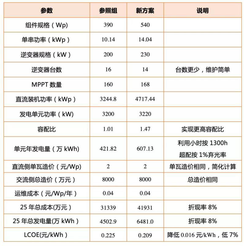 “230kW逆變器+高功率組件”VS“低功率逆變器+低功率組件”,即使不考慮直流端由大功率組件帶來的成本節(jié)省,直流端成本按相同處理,僅對(duì)比高功率組件帶來的交流側(cè)成本節(jié)省,經(jīng)分析發(fā)現(xiàn),可帶來約7%的LCOE降低。詳見表3。