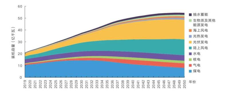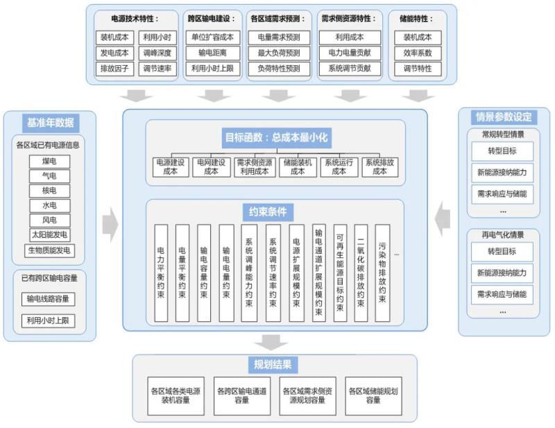 國網(wǎng)能源院能源互聯(lián)網(wǎng)研究所構(gòu)建了電力系統(tǒng)源-網(wǎng)-荷-儲協(xié)調(diào)規(guī)劃模型,自主開發(fā)了程序代碼,能夠?qū)σ?guī)劃期內(nèi)中國各區(qū)域各類電源、輸電通道、需求側(cè)資源、儲能等電力系統(tǒng)各個部分進行統(tǒng)籌規(guī)劃,得到電力系統(tǒng)整體最優(yōu)發(fā)展路徑。求解方式為通過建立數(shù)學優(yōu)化模型,將規(guī)劃期內(nèi)各年份各區(qū)域各類源網(wǎng)荷儲元素的發(fā)展規(guī)模設為待求解變量,構(gòu)建目標函數(shù)與約束條件,通過計算機編程的方式,求得一組滿足各項約束條件、且使得目標函數(shù)值最小的解。