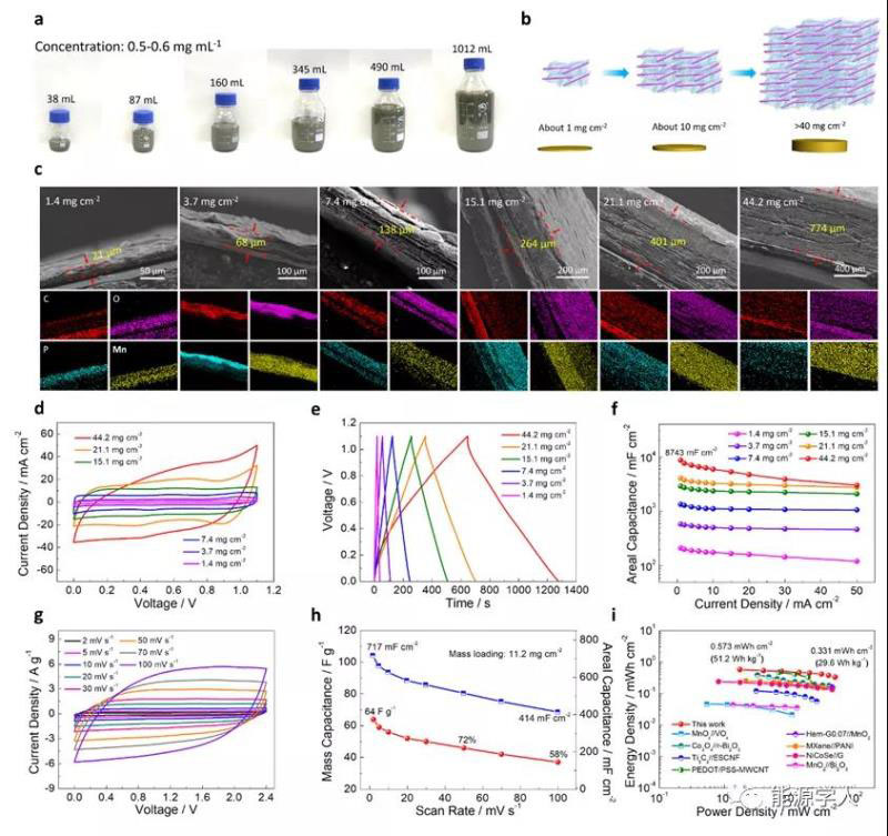 圖5 (a)不同體積膜液的數(shù)碼照片;(b)面擔(dān)載量的示意圖;(c) 不同厚度和面擔(dān)載量的P-Mn3O4/C膜的斷面SEM和元素mapping圖;(d) 不同面擔(dān)載量的P-Mn3O4/C膜的CV曲線(10 mV s-1)和(e)充放電曲線(10 mA cm-2);(f) 不同面擔(dān)載量P-Mn3O4/C比電容與電流密度的關(guān)系圖;在不同掃速下,P-Mn3O4/C//AC不對(duì)稱電容器的(g)CV曲線和(h) 比電容曲線;(i) P-Mn3O4/C//AC的Ragone曲線及其與文獻(xiàn)報(bào)道數(shù)據(jù)的對(duì)比圖。