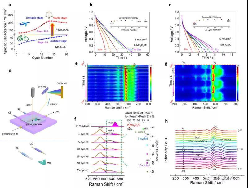 圖3 (a) P-Mn3O4/C和(b) Mn3O4/C不同循環(huán)后的比電容對(duì)比;(b) P-Mn3O4/C和(c) Mn3O4/C不同循環(huán)后的恒流放電曲線對(duì)比;(d) 原位拉曼測試示意圖;(e) P-Mn3O4/C電化學(xué)演化過程的原位拉曼mapping圖和(f) 相應(yīng)的不同循環(huán)后的拉曼圖譜;(g) 相演化后的P-Mn3O4/C在電荷存儲(chǔ)過程中的原位拉曼mapping圖和(h) 相應(yīng)的不同電壓下的拉曼圖譜。