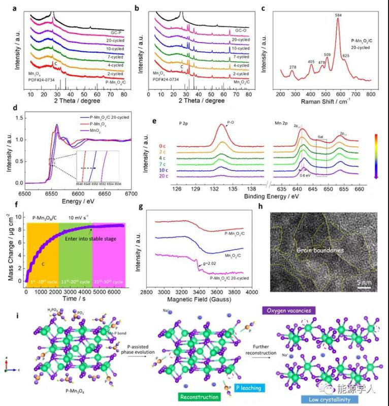 圖2 (a) P-Mn3O4/C和(b) Mn3O4/C不同循環(huán)后的XRD圖;(c) 經(jīng)20次循環(huán)后的P-Mn3O4/C的拉曼光譜;(d) 循環(huán)前后P-Mn3O4/C的Mn K邊XANES對(duì)比;(e) P-Mn3O4/C不同循環(huán)后的P 2p和Mn 2p的XPS譜圖;(f) P-Mn3O4/C相演化過程的質(zhì)量變化曲線;(g) Mn3O4/C和循環(huán)前后P-Mn3O4/C的EPR譜圖;(h) P-Mn3O4/C相演化后的HR-TEM圖片;(i) P-Mn3O4/C的相演化過程示意圖。