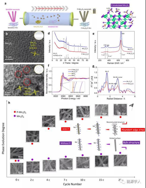 已有研究顯示,在過渡金屬氧化物中引入雜原子(P,S,N,Se…)可以有效調(diào)控其電子結(jié)構(gòu)、反應(yīng)活性、導(dǎo)電性和表面化學(xué)特性。鑒于此,研究人員基于Mn3O4的低價(jià)介穩(wěn)的特質(zhì),提出了一種磷誘導(dǎo)的超快相重構(gòu)策略,原位構(gòu)筑了富缺陷、高活性、高穩(wěn)定性的碳耦合MnO2,實(shí)現(xiàn)了碳耦合P摻雜Mn3O4(P-Mn3O4/C)自支撐膜電極的超高擔(dān)載(44.2 mg cm-2)及電極材料反應(yīng)動(dòng)力學(xué)過程的強(qiáng)化。此外,研究結(jié)果表明,磷誘導(dǎo)的超快相重構(gòu)策略具有普適性。該工作為過渡金屬化合物活性位和結(jié)構(gòu)缺陷的調(diào)控提供了有效的技術(shù)手段和途徑,對(duì)實(shí)現(xiàn)傳統(tǒng)材料的改進(jìn)及升級(jí)具有很好的借鑒意義。