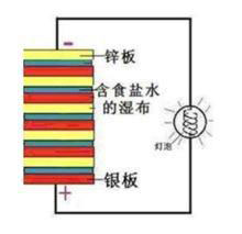 伏打最開始用幾只碗盛了鹽水,把幾對黃銅和鋅做成的電極連接起來,就產(chǎn)生了電流。之后他用更多的銅片和鋅片接觸,并且用相同數(shù)目的水層或比純水更好的導電液體層(食鹽、堿水)或皮革等海綿狀的物體間隔開,這樣一來,每一節(jié)原電池有一塊銅片和一塊鋅片用作電極,它們之間是一片浸過鹽水的布,作為電解質(zhì)。每個原電池有一個小的電動勢,而后伏打發(fā)現(xiàn),把這些原電池疊起就會有一個大的電動勢。并且原電池的一端帶正電,另一端帶負電,由此構成一個電流回路。