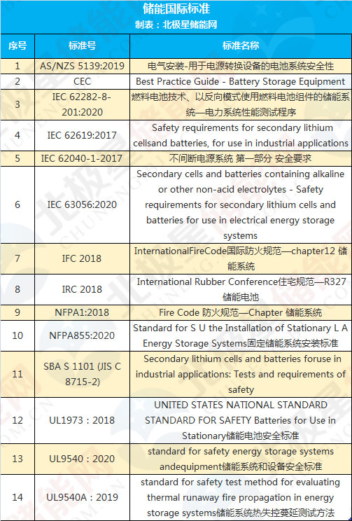 據(jù)北極儲能網(wǎng)不完全統(tǒng)計,目前我國現(xiàn)行標準體系中儲能及其相關產(chǎn)業(yè)鏈標準文件共計有160項,其中國家標準51項,行業(yè)標準60項,企業(yè)或地方標準49項 。關于儲能標準體系建設,美國、澳大利亞等主要國家都在積極探索,目前常用的儲能國際標準主要有14項。中國國內(nèi)的儲能標準主要涉及了儲能系統(tǒng)、儲能電池及儲能應用等方面,但對并網(wǎng)調(diào)試、產(chǎn)品檢測、尤其是消防安全、運維管理等方面仍有欠缺。